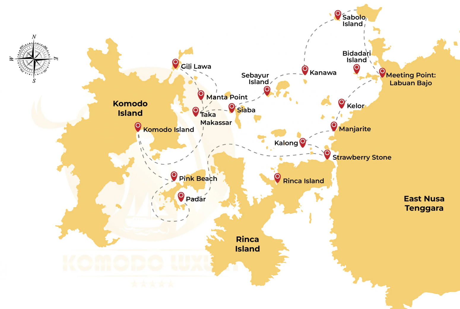 Táto plavba nie je len bežný výlet. Ponúkne vám nové zážitky, odkryje nové miesta a priblíži vás k divokosti prírody. Počas troch dní a dvoch nocí na lodi sa zastavíme na niekoľkých vzrušujúcich miestach vrátane Kelor Island, Manjarite Island, Kalong Island, Padar Island, Komodo Island, Pink Beach, Manta Point, Taka Makassar, Siaba Island a Kanawa Island.